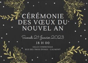 Sylvain Bonenfant, Maire de Caumont et son conseil municipal ont le plaisir de vous inviter à la cérémonie des vœux qui se déroulera le samedi 23 janvier 2023 à 18 heures à la salle communale , 2 rue des 3 épines.
