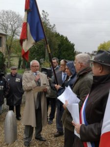 Le cortège était emmené cette année par 2 enfants des écoles, porteurs des gerbes de la Mairie et du Souvenir caumontais. Alain FONTAINE, Maire de Caumont, a commencé son discours en saluant la mémoire de Michel LALLEMAND, ancien Président du Souvenir caumontais, décédé cet été, et présenté son successeur, l’Amiral Arnaud DE TARLE.