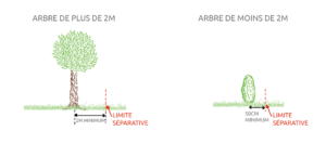 - s’ils ont une hauteur supérieure à 2 m, ils doivent être plantés à une distance minimale de 2 m de la limite de propriété,